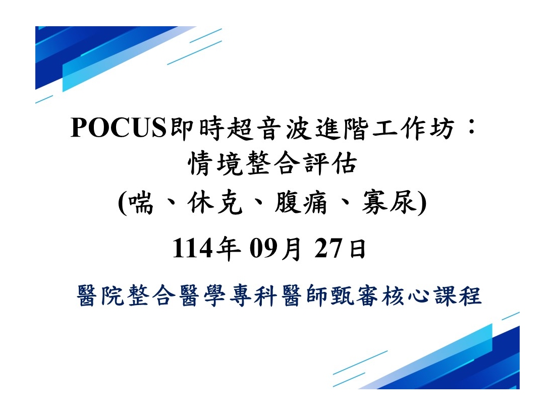 • 114.09.27 臺灣醫院整合醫學醫學會-POCUS即時超音波進階工作坊:情境整合評估(喘、休克、腹痛、寡尿)