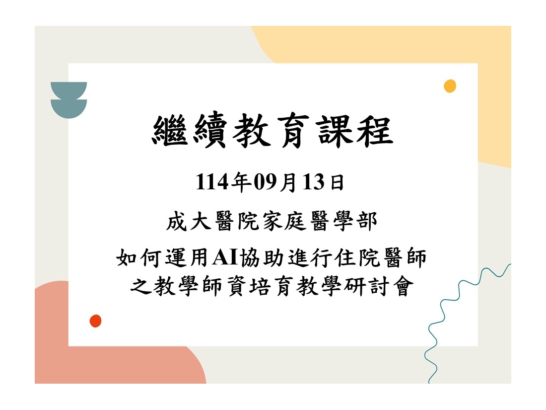 • 114.09.13 成大醫院家庭醫學部-如何運用AI協助進行住院醫師之教學師資培育教學研討會