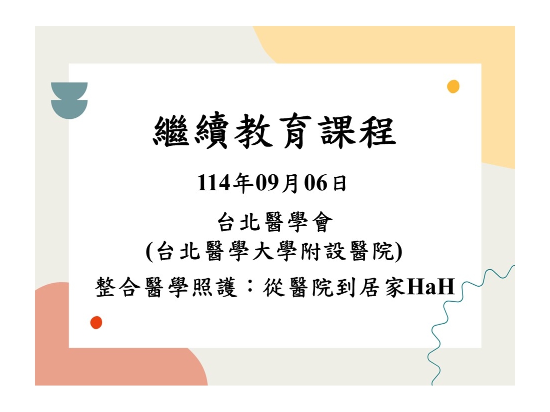 • 114.09.06 台北醫學會(台北醫學大學附設醫院)-整合醫學照護:從醫院到居家HaH