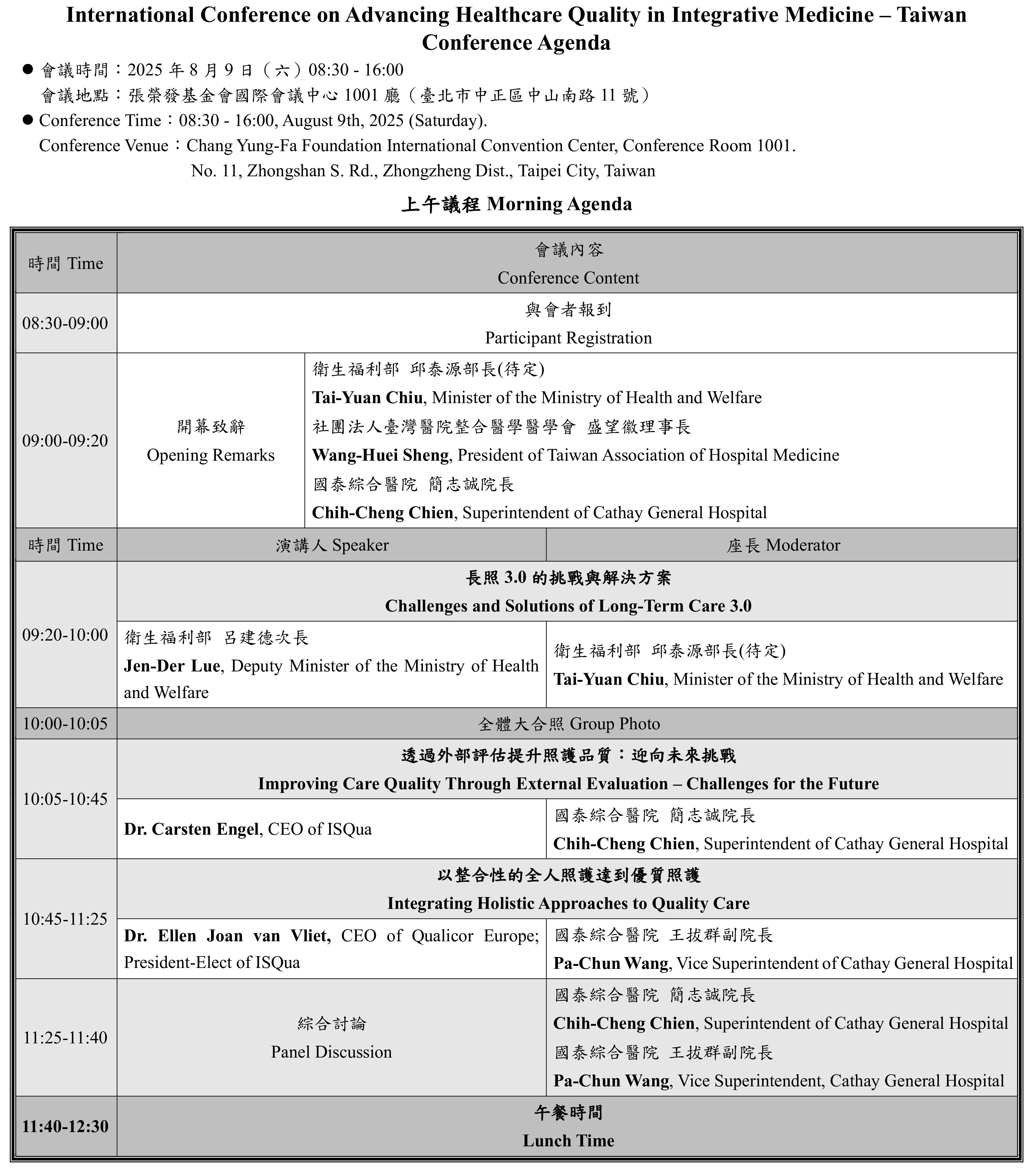 整合醫學品質國際研討會 一、日期及時間:114年8月9日 08:30-16:00 二、主辦單位:國泰綜合醫院社區醫學部 三、地點:張榮發基金會國際會議中心1001會議廳(臺北市中正區中山南路11號) 四、報名方式:需報名:https://forms.gle/i3BBL7P1BFjFTQEn9 五、課程收費:不收費 六、學分:社團法人臺灣醫院整合醫學醫學會 B 類 6 學分 ※ 其他單位繼續教育積分、課程或有更新異動,以主辦單位公告為準。 研討會網站:https://reurl.cc/YYMX0a