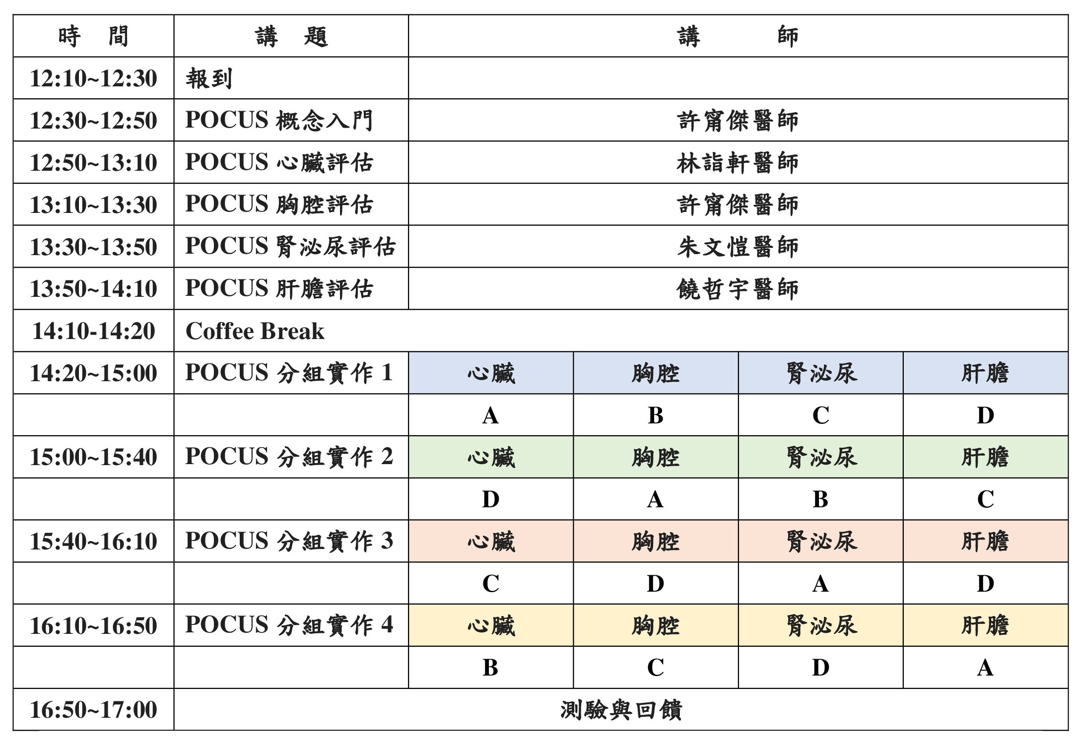 一、主辦單位:社團法人臺灣醫院整合醫學醫學會 二、課程時間:114年11月8日 (星期六) 12:30-17:00 (12:10開始報到) 三、上課地點:臺大景福館1樓 (台北市中正區公園路15-2號) 四、報名期間:至10月22日 16:00 (或額滿為止) 五、報名網址:https://reurl.cc/6q9gyZ 六、報名對象:醫師 七、人數:24人及候補名額2人 八、費用:會員4,500元,非會員6,000元,曾參加由臺灣醫院整合醫學醫學會主辦之工作坊會員3,500元、非會員5,000元(請提供上課日期)。於報名後三個工作天內通知繳費。取消報名請於10月29日前通知,於扣除手續費200元後退還報名費,10月30日起恕不退費。 九、學分:社團法人臺灣醫院整合醫學醫學會A類15分 ※ 此課程認列醫院整合醫學專科醫師甄審核心課程 課程時間表 ![]() |